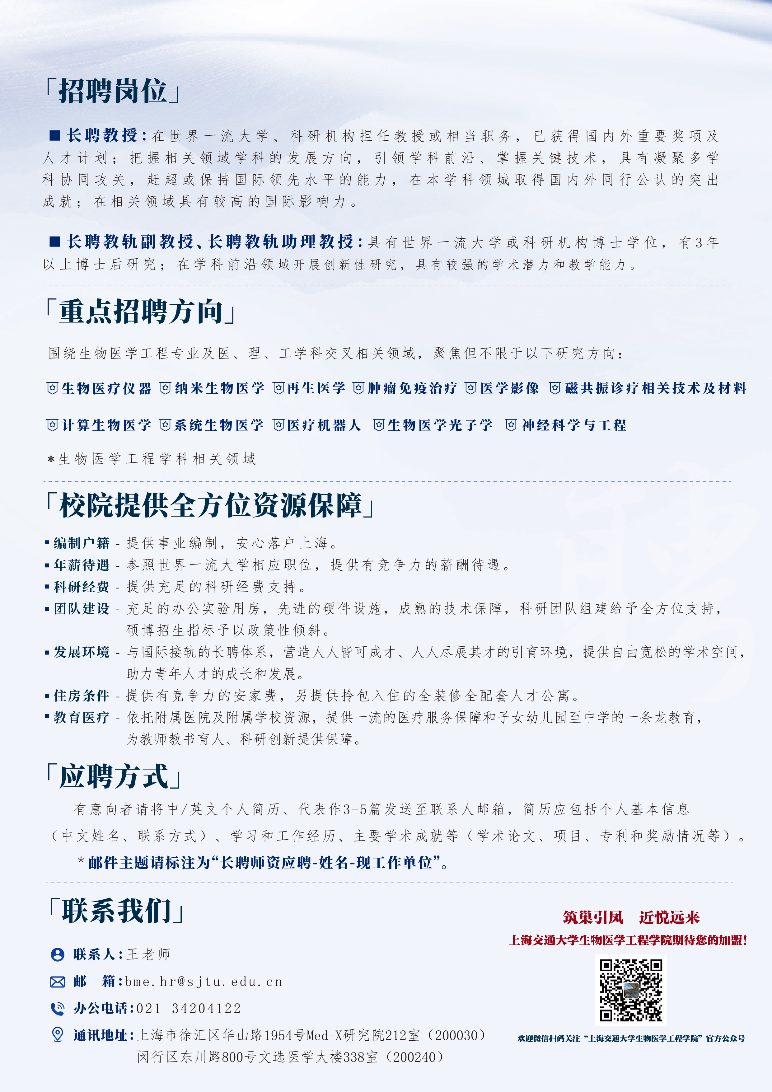 【人才招聘】竭诚欢迎海内外英才加盟上海交通大学生物医学工程学院