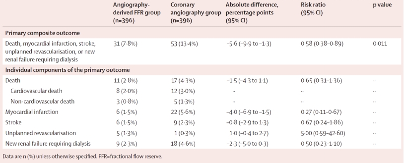 入组患者被随机分为两组:(1)QFR指导组:仅对QFR值≤0.80(提示存在心肌缺血)的病变血管进行搭桥;(2)造影指导组:对所有造影显示狭窄≥50%的血管进行搭桥。